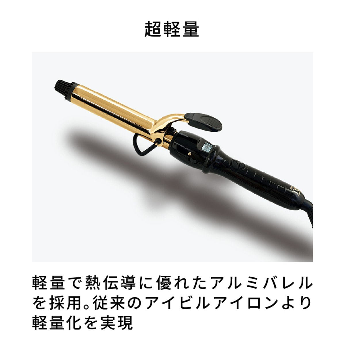 軽くて熱伝導に優れたアルミにチタン/ゴールドにコーティングされた長い髪でも逃げないロングバレル(105㎜)を採用することで、鉄製のバレルに比べ、約30%の軽量化を図りました。